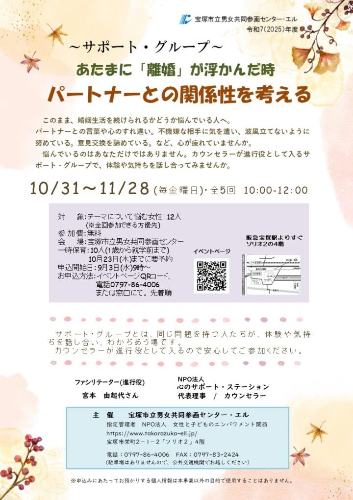 ▶パートナーと対等な関係性を築きにくく、言葉や心のすれ違いを繰り返し、しんどいなあ…と悩んでいませんか ▶【サポート・グループ】は カウンセラーがファシリテーターとして入り、同じ問題を持つ人たちがお互いの体験や気持ちを話[…..]