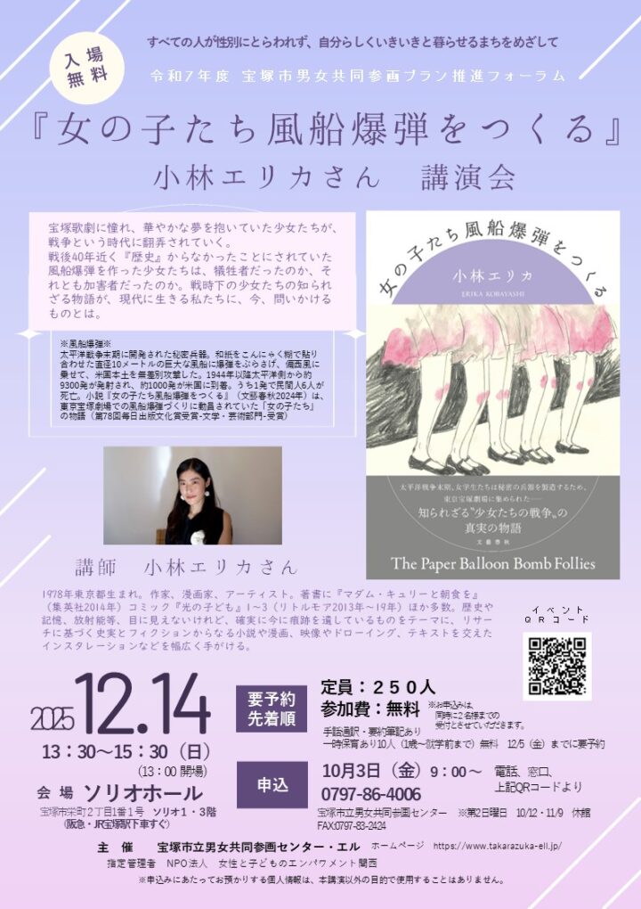 令和7年度 宝塚市男女共同参画プラン推進フォーラム 小林エリカさん講演会『女の子たち風船爆弾をつくる』 作家、漫画家、アーティストの小林エリカさんによる講演会です 宝塚歌劇に憧れ、華やかな夢を抱いていた少女たちが、戦[…..]