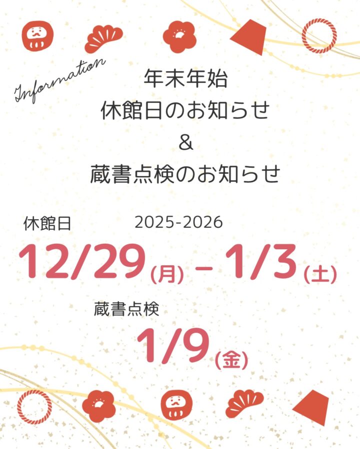 いつもセンターをご利用いただきありがとうございます。 当センターは、年末年始の2025年12月29日(月)~2026年1月3日(土)の期間は休館いたします。 また、2026年1月9日(金)は、蔵書点検のため、図書の貸出、[…..]